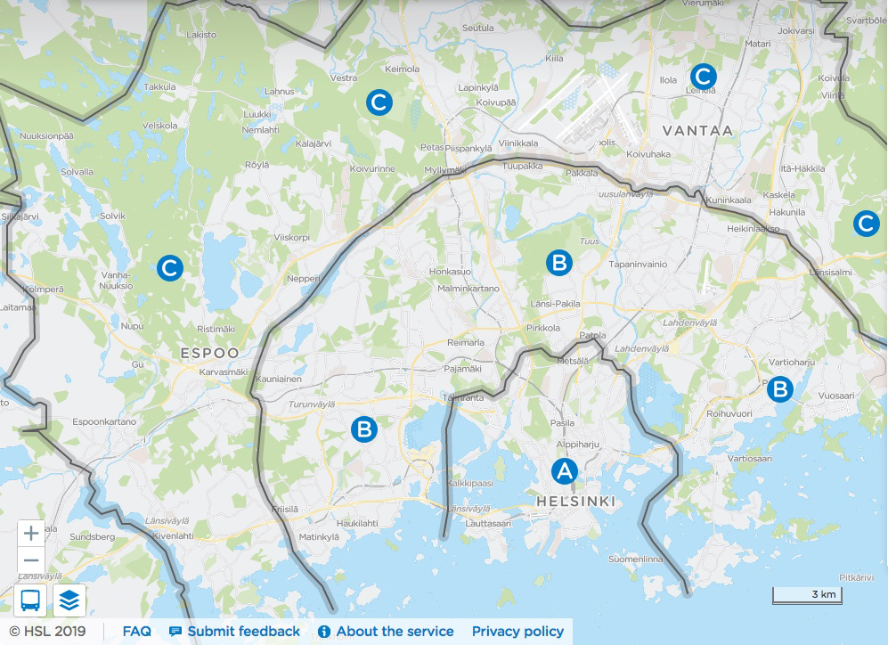 ゾーンは、ヘルシンキ中心部を A 、ヘルシンキ郊外とエスポー市、ヴァンター市の一部を B 、その外側で空港のあるエリアを C 、さらにその外側が D となります。図を参考にしてください。